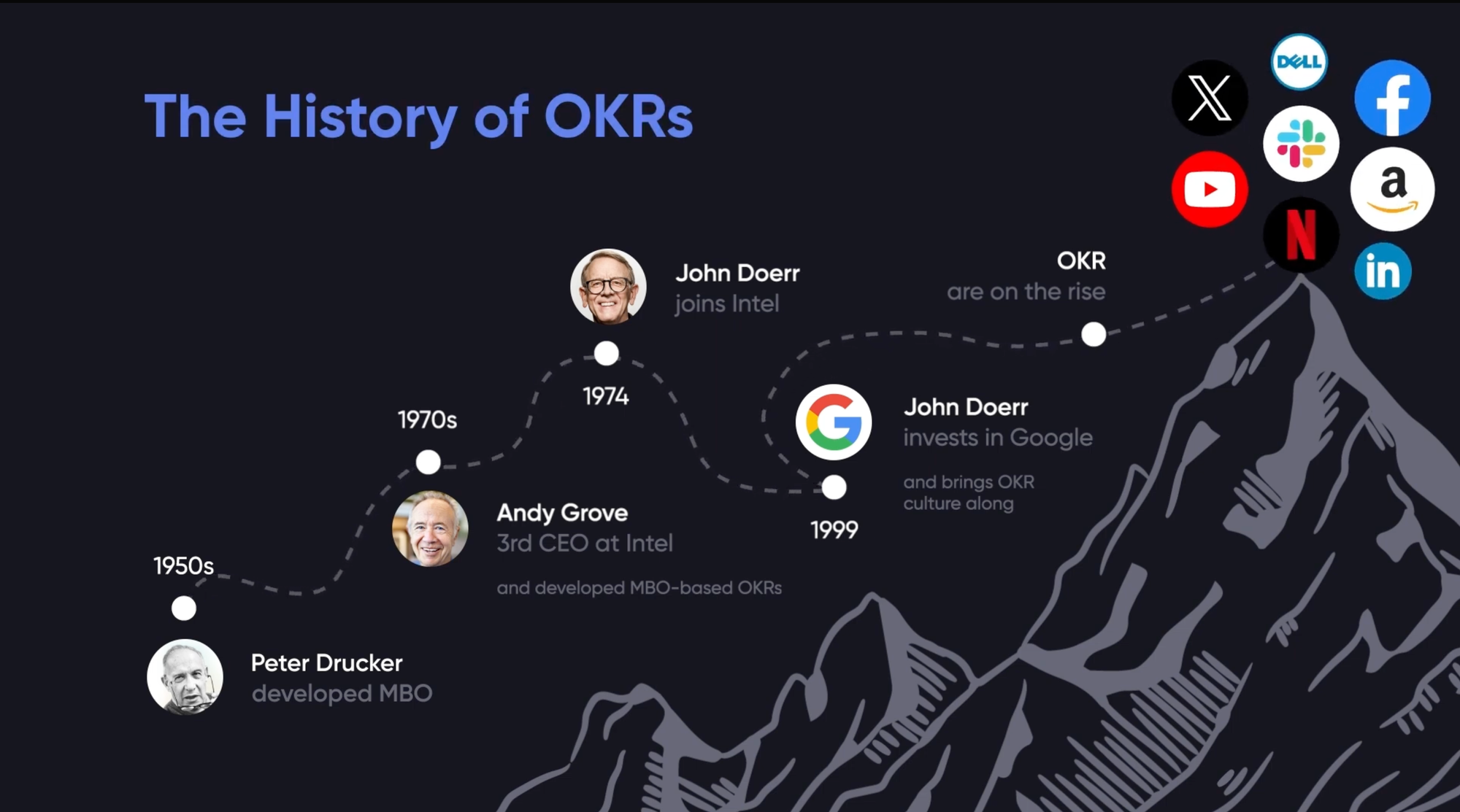 Идеи OKR выросли из MBO Питера Друкера (1950‑е). В 1970‑х Энди Гроув в Intel адаптировал подход и сформировал современную модель OKR. В 1999 году Джон Дьюер принёс OKR в Google, где система стала ядром культуры целеполагания и далее распространилась по индустрии (YouTube, Slack, Netflix, Amazon, Walmart) .