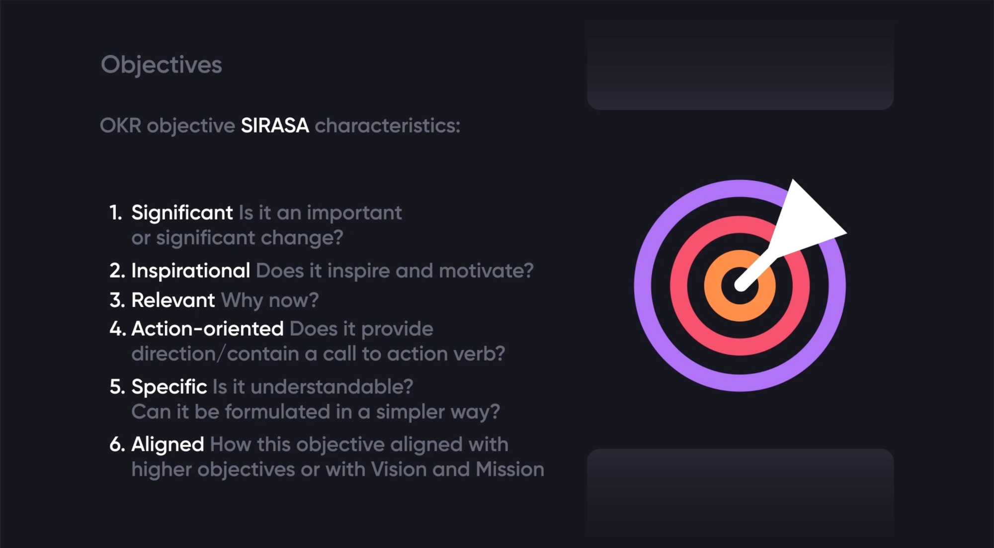 - Цель (Objective) — чётко сформулированный, вдохновляющий и направленный на действие вектор изменений.