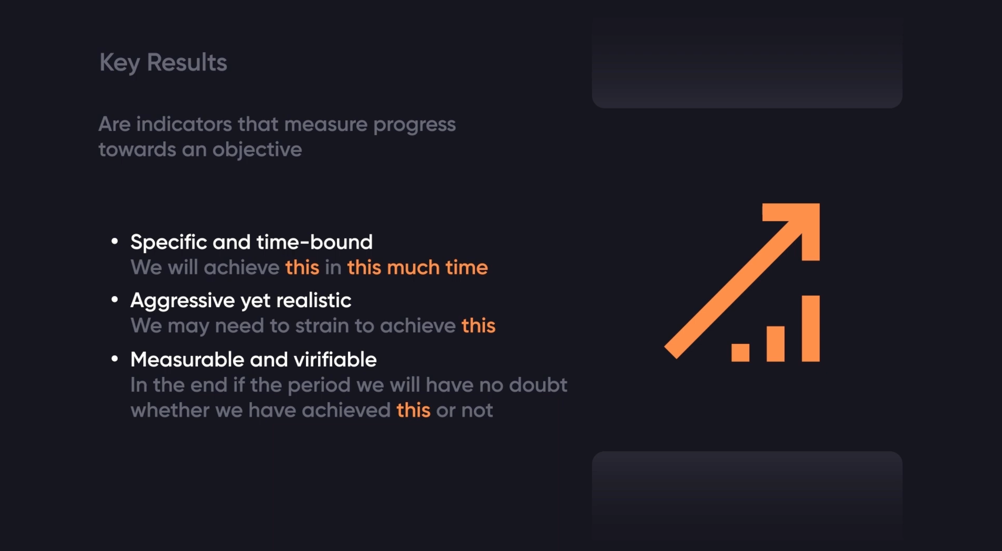 - Ключевые результаты (Key Results) — количественные индикаторы прогресса, однозначно проверяемые в конце периода (обычно квартал).