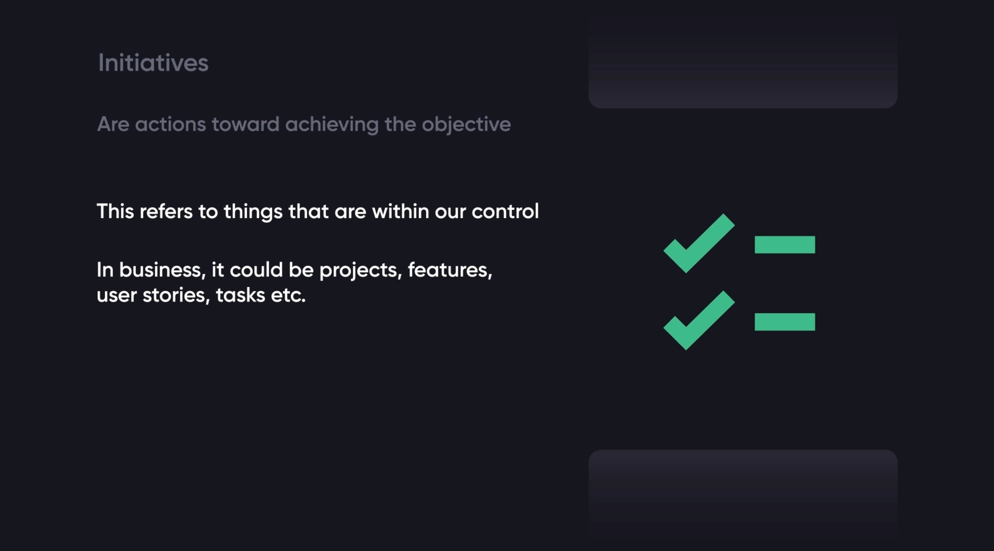 - Инициативы (Initiatives) — действия и проекты, находящиеся под нашим контролем, с помощью которых мы достигаем ключевых результатов .